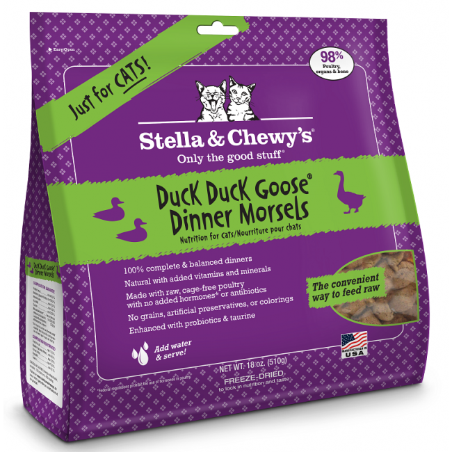 Duck Duck Goose Dinner is formulated to meet the nutritional levels established by the AAFCO Cat Food Nutrient Profiles for All Life Stages.