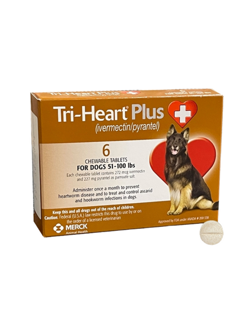 View full detailsDogs of any age, even older dogs, can become infected with heartworms, roundworms or hookworms.Tri-Heart Plus chewable tablets contain a proven co...