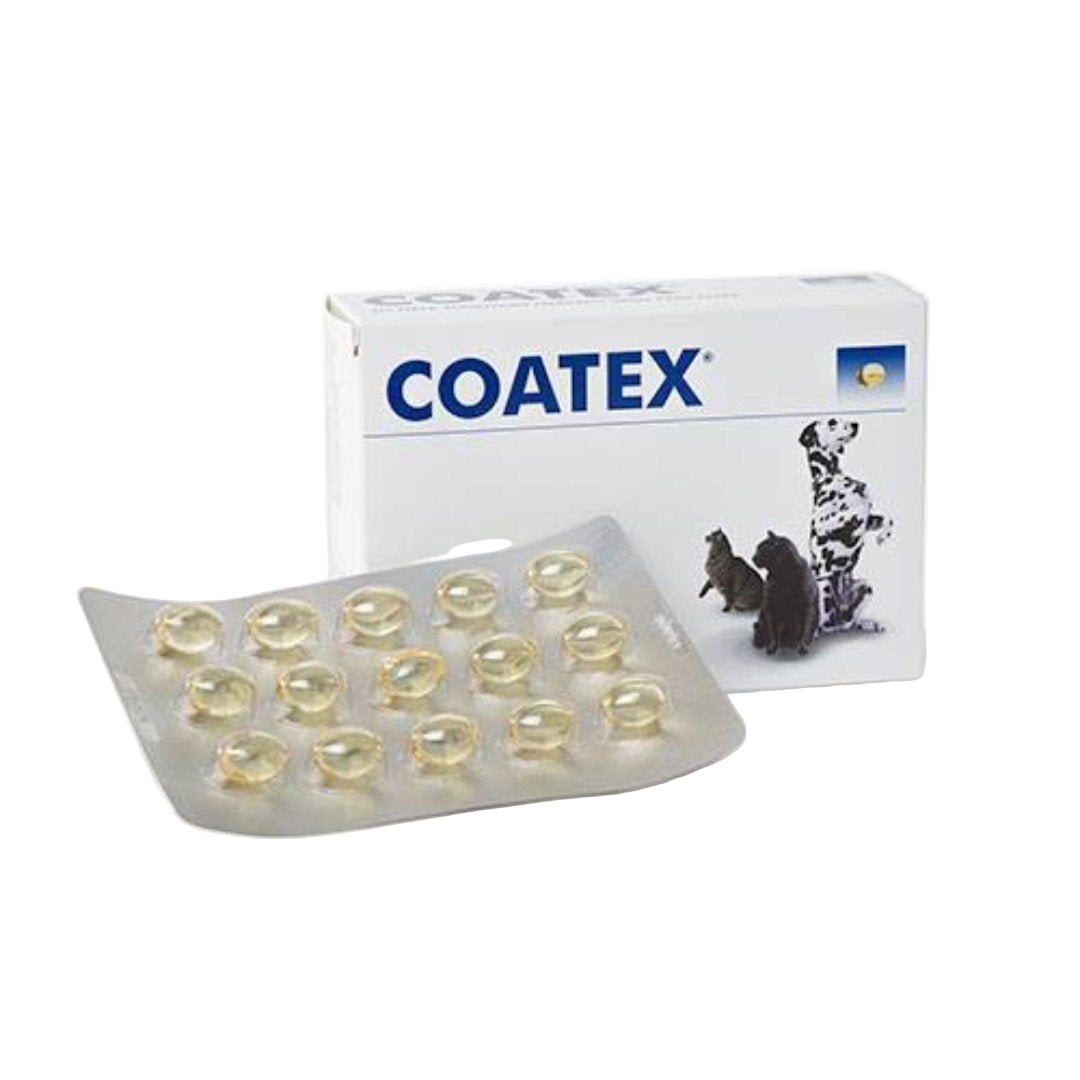 Coatex Capsules are a feed supplement to help maintain a healthy skin and coat in cats and dogs. It contains a proven blend of Omega 3 and Omega 6 EFAs.
