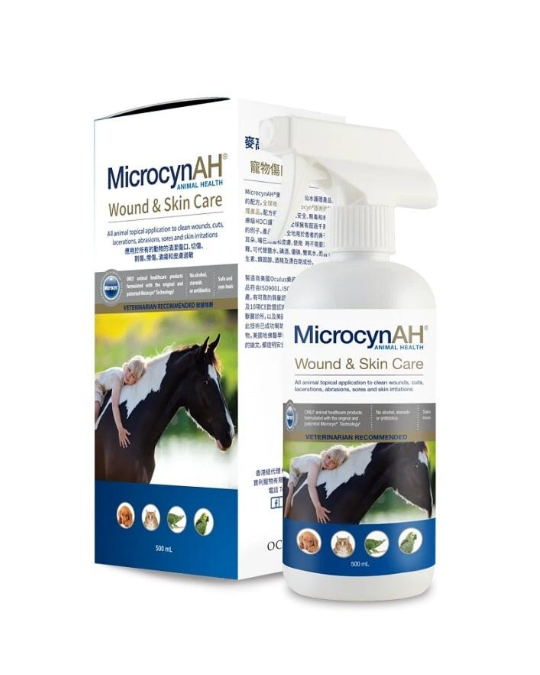 使用方法:使用前請搖勻。去除傷口周圍多餘的毛髮。如有必要,可修剪。用MicrocynAH®浸透患處。如果需要敷料,每次更換敷料時,請使用MicrocynAH®浸透敷料。每日重複3-4次,直到傷口癒合或遵照獸醫的治療方案。無需沖洗。可安全用於口腔、鼻腔、耳朵和眼睛周圍。